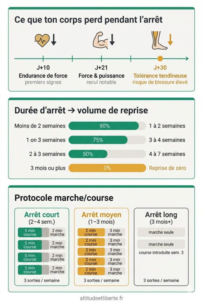 Comprendre ce mécanisme, c’est déjà éviter la moitié des erreurs. La suite, c’est un protocole clair : des repères chiffrés selon la durée de ton arrêt, une méthode éprouvée pour progresser sans reculer, et les signaux qui doivent t’arrêter net.